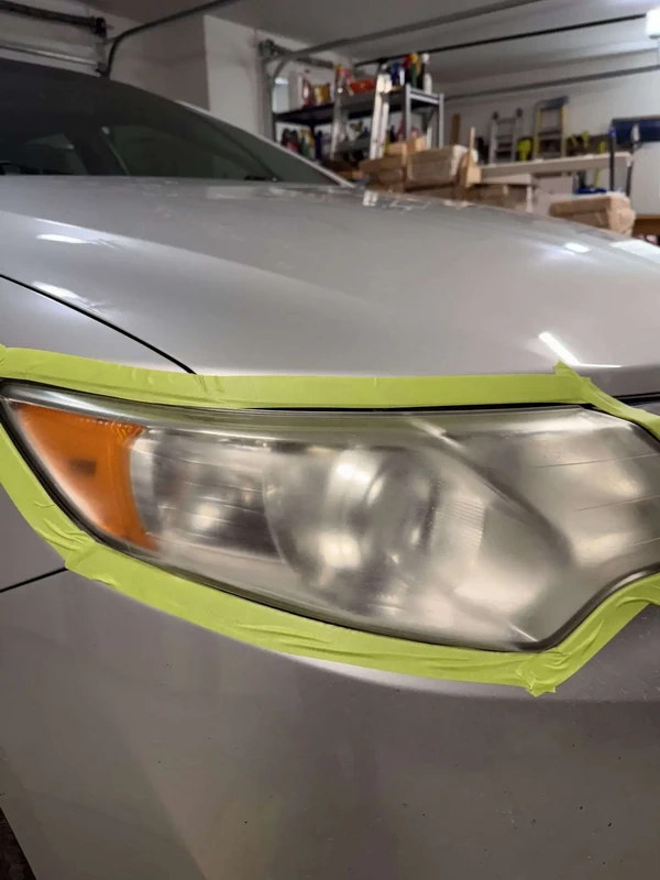 - Prep & Masking: We carefully tape off the surrounding paint and trim to ensure only the headlight lens is touched during the process.